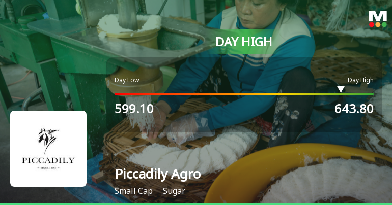 2026-02-19 10:30:47Piccadily Agro Industries Ltd demonstrated robust intraday strength on 19 Feb 2026, surging to a day’s high of Rs 635.2, marking a 7.62% increase. The stock outperformed its sector and broader market indices, continuing its recent positive momentum with gains over consecutive sessions.