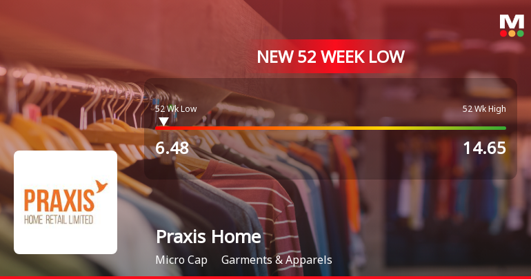 2026-03-10 10:49:15Praxis Home Retail Ltd has reached a new 52-week low of Rs.6.48 today, marking a significant decline amid persistent downward momentum. The stock has underperformed its sector and benchmark indices, reflecting ongoing financial pressures and subdued market sentiment.