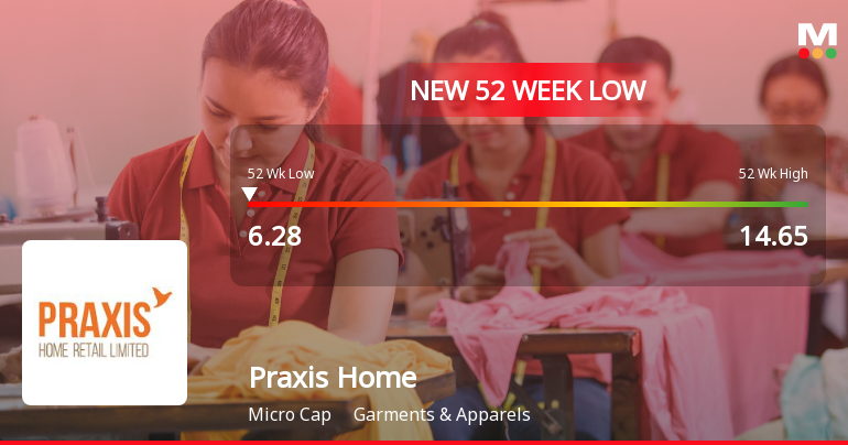 2026-03-16 11:42:18Praxis Home Retail Ltd has touched a new 52-week and all-time low of Rs.6.28 today, marking a significant decline in its stock price amid sustained negative performance and weakening fundamentals within the Garments & Apparels sector.