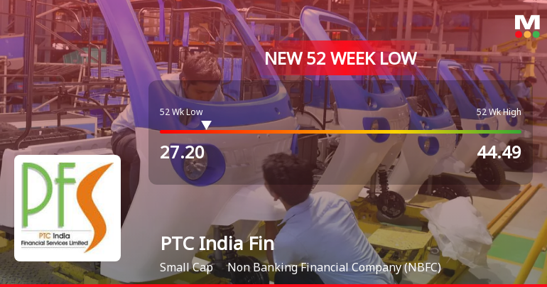 2026-03-16 10:13:08PTC India Financial Services Ltd has declined to a fresh 52-week low of Rs.24.03, marking a significant price level for the non-banking financial company (NBFC) amid a challenging market environment. The stock’s performance today was in line with its sector, reflecting ongoing pressures within the NBFC space and broader market dynamics.