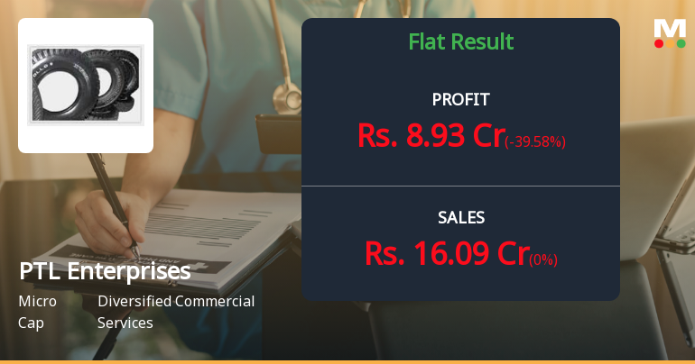2026-02-05 09:52:40PTL Enterprises Ltd., a micro-cap diversified commercial services company with a market capitalisation of ₹567.90 crores, reported a net profit of ₹8.93 crores for Q3 FY26 (Oct-Dec'25), marking a 6.31% increase year-on-year from ₹8.40 crores in Q3 FY25. However, on a sequential basis, profit declined 39.58% from ₹14.78 crores in Q2 FY26, primarily due to normalisation of other income which had spiked unusually in the previous quarter. The stock traded at ₹42.90 on February 5, 2026, gaining 2.29% on the day, though the company's fundamental growth story remains conspicuously absent.