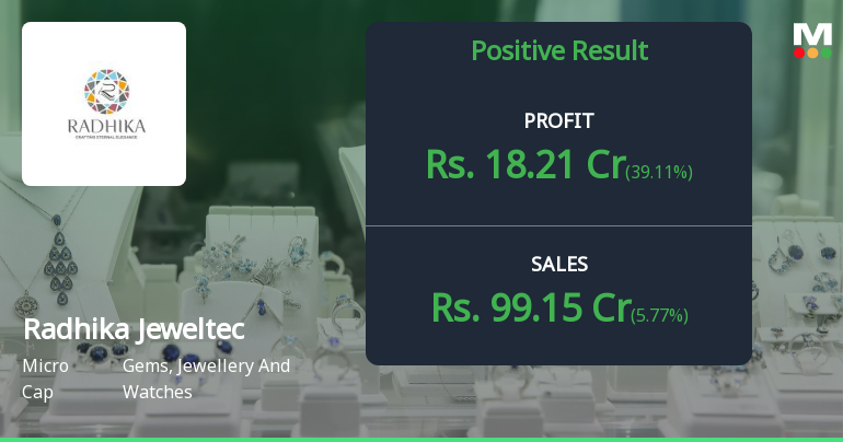 2026-02-12 09:53:23Radhika Jeweltech Ltd., a micro-cap player in India's gems and jewellery sector, delivered its strongest quarterly performance in Q3 FY26, posting net profit of ₹30.64 crores—a robust 66.48% surge quarter-on-quarter and 34.80% growth year-on-year. With a market capitalisation of ₹863.29 crores, the Rajkot-based company has demonstrated impressive top-line acceleration, though margin compression and recent stock underperformance warrant careful examination from investors.
