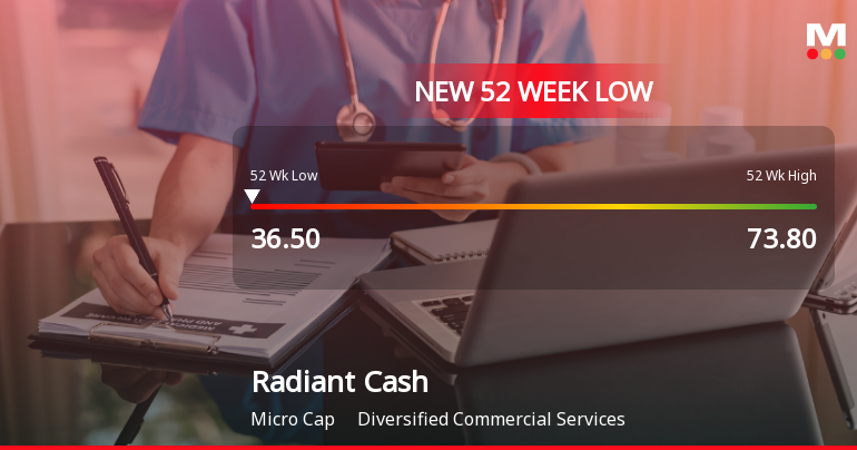 2026-02-25 14:03:10Radiant Cash Management Services Ltd has reached an all-time low, closing just 0.73% above its 52-week low of ₹36.63, marking a significant decline amid sustained underperformance across multiple timeframes and key financial metrics.