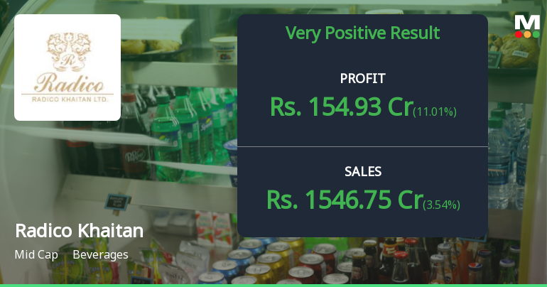 Radico Khaitan Ltd. has reported a robust performance for the quarter ended December 2025, showcasing significant operational strength. The company achieved a net profit of ₹154.93 crores, reflecting a year-on-year growth of 62.25%. This growth is supported by a notable revenue increase of 19.51%, with net sales reaching ₹1,546.75 crores, marking the highest quarterly revenue in the company's history. Sequentially, revenue also demonstrated sustained momentum, with a 3.54% increase from the previous quarter.