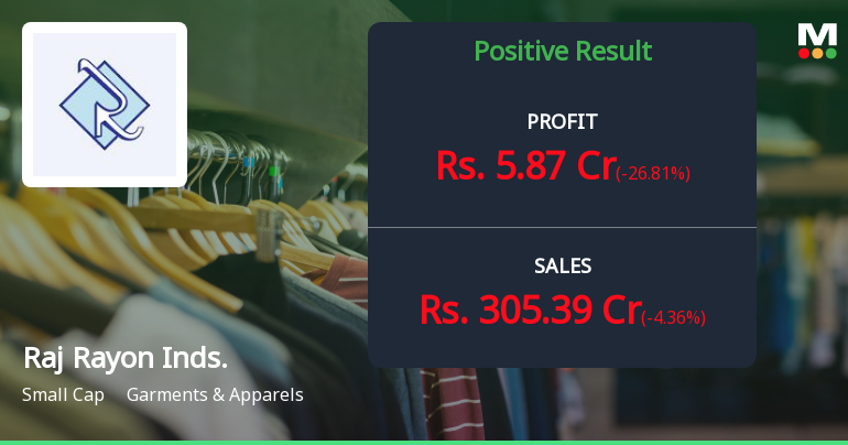 2026-02-06 15:18:45Raj Rayon Industries Ltd., a Silvassa-based manufacturer of polyester texturised yarn, posted a net profit of ₹5.87 crores in Q3 FY26, marking a sequential decline of 26.81% from Q2 FY26's ₹8.02 crores but representing a 27.98% decline year-on-year from ₹8.15 crores in Q3 FY25. The company's shares, trading at ₹21.61 with a market capitalisation of ₹1,202 crores, have underperformed significantly over the past six months, declining 20.49% against the Sensex's 3.77% gain.
