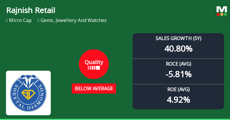 2026-01-23 08:00:07Rajnish Retail Ltd, a player in the Gems, Jewellery and Watches sector, has seen a significant downgrade in its quality grading from average to below average, prompting MarketsMOJO to revise its rating from Sell to Strong Sell as of 26 September 2025. This shift reflects deteriorating business fundamentals, including weakening profitability ratios, inconsistent earnings growth, and a challenging debt profile, raising concerns about the company’s near-term prospects despite its impressive long-term stock returns.