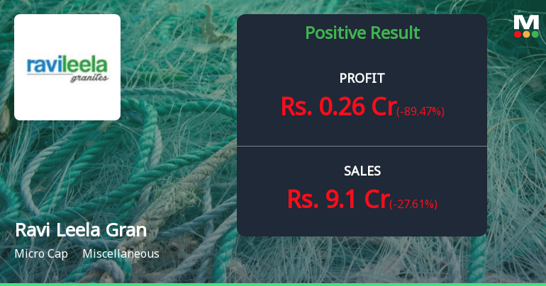 2026-02-14 08:52:17Ravi Leela Granites Ltd., a micro-cap granite manufacturer with a market capitalisation of ₹54.00 crores, reported a sharp sequential decline in profitability for Q3 FY26, with net profit plunging 89.47% quarter-on-quarter to ₹0.26 crores from ₹2.47 crores in Q2 FY26. Despite this quarterly setback, the company posted a modest 9.11% year-on-year improvement from ₹0.24 crores in Q3 FY25, though the stock gained 1.01% to trade at ₹50.00 following the results announcement.