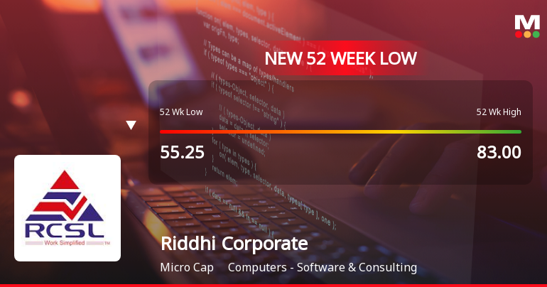 2026-03-16 11:40:37Shares of Riddhi Corporate Services Ltd touched a fresh 52-week low of Rs.55.25 on 16 Mar 2026, marking a significant decline amid broader sectoral and market pressures. The stock has experienced a notable downtrend, reflecting ongoing concerns about its financial performance and valuation metrics.