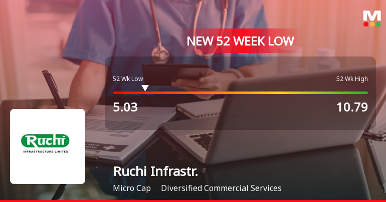 Ruchi Infrastructure Ltd’s share price touched a new 52-week low of Rs.5.03 today, marking a significant decline amid broader market weakness and persistent company-specific concerns. The stock’s performance continues to lag behind its sector and benchmark indices, reflecting ongoing challenges in its financial metrics and market positioning.