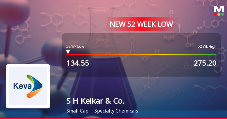 2026-03-05 14:15:07S H Kelkar & Company Ltd, a player in the specialty chemicals sector, has reached a new 52-week low of Rs.134.3 today, marking a significant decline amid a sustained downward trend. The stock has underperformed its sector and broader market indices, reflecting ongoing concerns about its financial performance and valuation metrics.