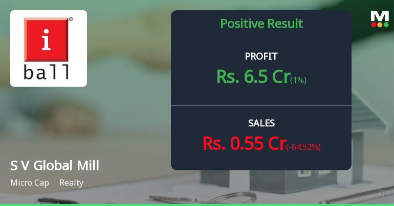 2026-02-05 17:46:20S V Global Mill Ltd., a micro-cap realty company with a market capitalisation of ₹270.00 crores, reported a consolidated net profit of ₹6.50 crores in Q3 FY26 (October-December 2025), marking a dramatic swing from the ₹0.71 crore loss recorded in the previous quarter. However, this impressive turnaround conceals a troubling operational reality: the company's core business continues to deteriorate, with the quarterly profit driven almost entirely by exceptional other income of ₹11.30 crores.