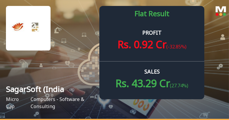 2026-02-13 09:26:24SagarSoft (India) Ltd., a Hyderabad-based IT services and consulting firm, posted consolidated net profit of ₹0.92 crores in Q3 FY26 (Dec'25), rebounding from a loss of ₹0.94 crores in the previous quarter but declining 32.85% year-on-year from ₹1.37 crores in Dec'24. The micro-cap company, with a market capitalisation of ₹61.00 crores, continues to grapple with severe margin pressures and operational inefficiencies despite achieving its highest quarterly revenue on record at ₹43.29 crores.