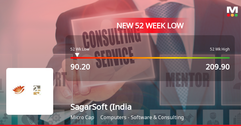 2026-01-21 10:56:38SagarSoft (India) Ltd’s shares declined sharply to a new 52-week low of Rs.90.2 on 21 Jan 2026, marking a significant drop amid a broader market downturn and persistent underperformance relative to its sector and benchmark indices.