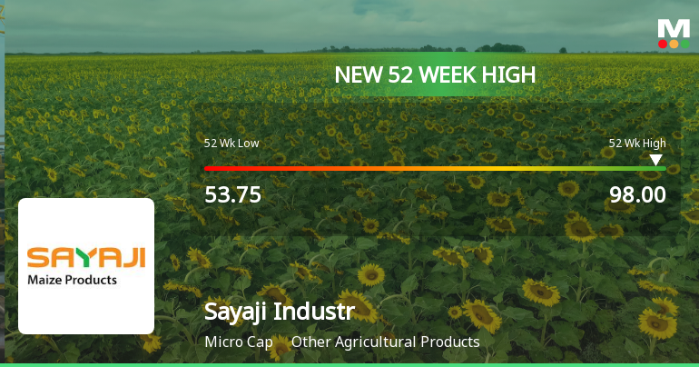 2026-02-16 09:58:17Sayaji Industries Ltd, a key player in the Other Agricultural Products sector, reached a significant milestone today by hitting a new 52-week high of Rs.97.68. This achievement marks a notable surge in the stock’s momentum, reflecting sustained gains over the past week and outperforming its sector peers.