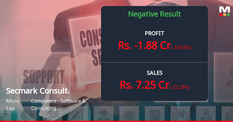 2026-02-14 00:10:03Secmark Consultancy Limited, a micro-cap IT consulting firm with a market capitalisation of ₹115.00 crores, reported a sharp deterioration in its Q3 FY26 performance, posting a net loss of ₹1.88 crores compared to a profit of ₹0.86 crores in Q2 FY26—marking a staggering 318.60% quarter-on-quarter decline. The company's revenue contracted 22.29% sequentially to ₹7.25 crores whilst operating margins collapsed into deeply negative territory at -23.72%, raising serious concerns about the sustainability of its business model.