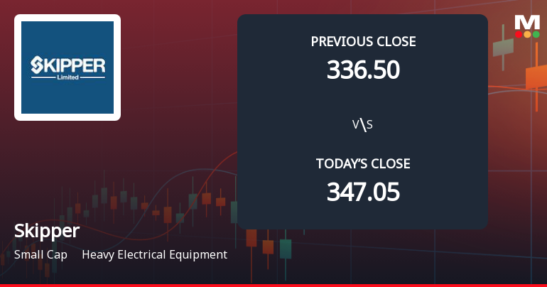 2026-03-12 13:00:53Skipper Ltd recorded a robust intraday performance on 12 Mar 2026, surging to a day’s high of Rs 367, marking a 7.99% increase from its previous close. This strong uptick outpaced the Heavy Electrical Equipment sector by 7.22% and contrasted sharply with the broader market’s subdued tone.
