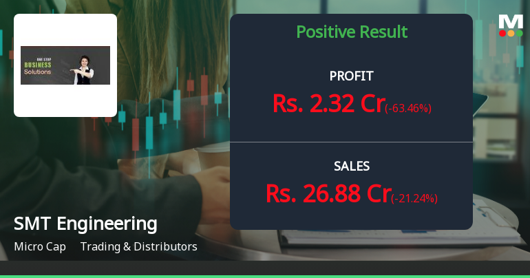 2026-02-13 12:11:32SMT Engineering Ltd., a micro-cap trading and distribution company with a market capitalisation of ₹562.00 crores, reported consolidated net profit of ₹2.32 crores for Q3 FY26 (October-December 2025), marking a dramatic sequential decline of 63.46% from the previous quarter's ₹6.35 crores. Despite this sharp quarterly contraction, the year-on-year comparison reveals an extraordinary transformation, with profits surging 5,700.00% from a mere ₹0.04 crores in Q3 FY25, underscoring the company's remarkable turnaround from near-dormancy to operational scale.