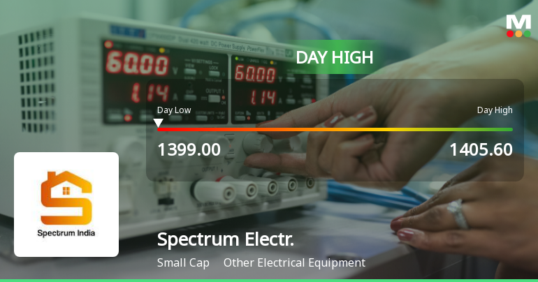 2026-02-26 09:46:02Spectrum Electrical Industries Ltd recorded a robust intraday performance on 26 Feb 2026, surging to an intraday high of Rs 1,405.6, marking an 11.5% gain. This sharp rise reversed a four-day downward trend and outpaced the broader sector and market indices, reflecting notable trading momentum in the Other Electrical Equipment sector.