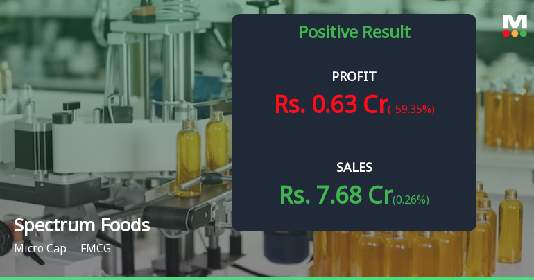 2026-02-13 23:54:29Spectrum Foods Limited, a Jaipur-based B2B salt and spices manufacturer, reported a challenging Q3 FY26 performance marked by severe margin contraction despite modest revenue growth. The company posted a net profit of ₹0.63 crores for the quarter ended December 2025, representing a sharp 59.35% decline quarter-on-quarter (QoQ) from ₹1.55 crores in Q2 FY26, though showing year-on-year (YoY) improvement of 173.91% from ₹0.23 crores in Q3 FY25. With a market capitalisation of ₹34.00 crores, the micro-cap company faces mounting scrutiny as operating margins collapsed to 10.55% from 22.85% in the previous quarter.