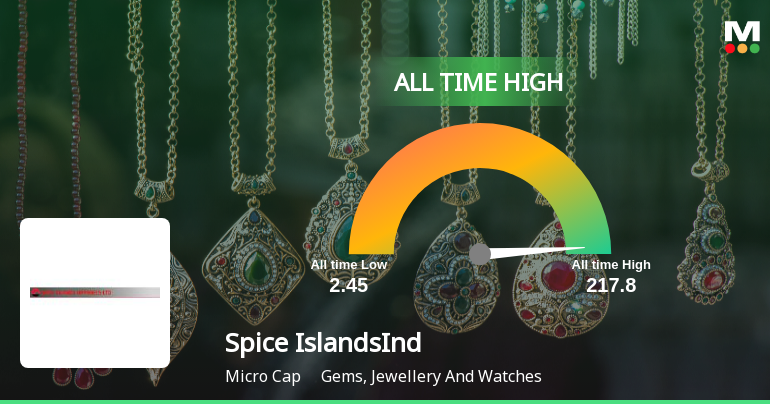 2026-01-09 09:30:55Spice Islands Industries Ltd, a key player in the Gems, Jewellery and Watches sector, reached a new all-time high of Rs.217.8 on 9 Jan 2026, underscoring a significant surge in its stock price driven by sustained strong performance across multiple time frames.