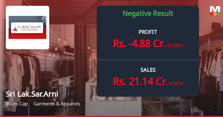 2026-02-12 15:31:25Sri Lakshmi Saraswathi Textiles (Arni) Ltd., a Chennai-based yarn and surgical face mask manufacturer, reported a widening net loss of ₹4.88 crores in Q3 FY26 (October-December 2025), marking a deterioration of 47.88% quarter-on-quarter and 10.78% year-on-year. The micro-cap textile company, with a market capitalisation of just ₹10.00 crores, continues to grapple with severe operational difficulties as sales contracted 9.66% sequentially to ₹21.14 crores—the lowest quarterly revenue in over two years.