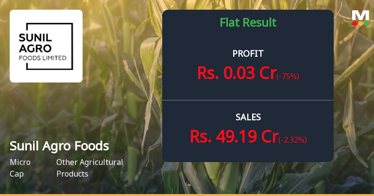 2026-02-10 18:31:58Sunil Agro Foods Ltd., a micro-cap player in the agricultural products sector with a market capitalisation of ₹28.00 crores, reported a modest return to profitability in Q3 FY26 (October-December 2025), posting a net profit of ₹0.03 crores. However, this marginal recovery—achieved after two consecutive quarters of losses—comes against a backdrop of contracting revenues, deteriorating margins over the past year, and a stock price that has plummeted 25.78% over the last twelve months, significantly underperforming both the benchmark Sensex and its sector peers.