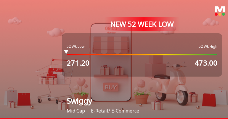 2026-03-12 11:13:32Shares of Swiggy Ltd, a key player in the E-Retail and E-Commerce sector, declined sharply to a new 52-week low of Rs.271.2 on 12 Mar 2026, marking a significant milestone in the stock’s recent performance. This drop comes amid broader market weakness and reflects ongoing concerns about the company’s financial health and valuation metrics.