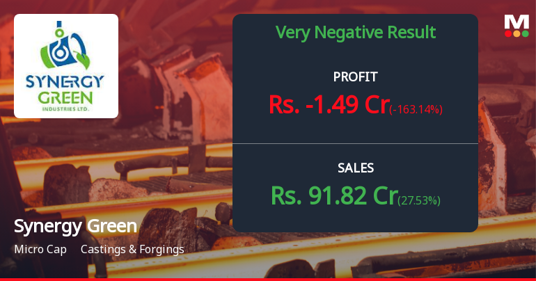 2026-02-11 17:49:17Synergy Green Industries Ltd., a micro-cap castings and forgings manufacturer, reported a jarring quarterly loss of ₹1.49 crores for Q3 FY26, marking a dramatic reversal from the ₹2.36 crore profit posted in the previous quarter and a steep decline from the ₹5.95 crore profit in Q3 FY25. The market reacted swiftly and severely, with shares plummeting 12.44% to ₹470.00 on February 11, 2026, erasing investor confidence built over the company's recent growth trajectory.