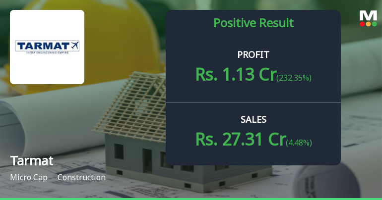 2026-02-05 18:00:28Tarmat Limited, a Mumbai-based construction company with a market capitalisation of ₹139.00 crores, reported a striking 232.35% year-on-year surge in net profit to ₹1.13 crores for Q3 FY26 (October-December 2025), though the sequential decline of 22.60% from Q2's ₹1.46 crores raises questions about sustainability. The stock traded at ₹55.98 on February 05, 2026, gaining 1.03% in post-result trading sessions, yet remains down 18.12% over the past year, significantly underperforming both the Sensex and its construction sector peers.