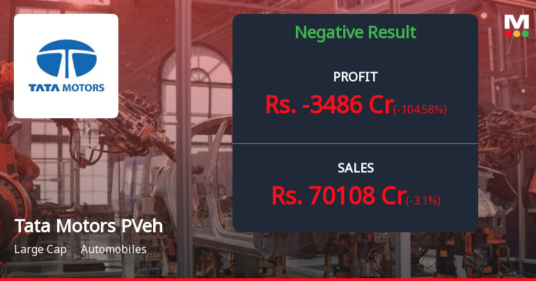 2026-02-06 19:26:16The latest financial results for Tata Motors Passenger Vehicles Ltd indicate significant challenges across various operational metrics. In the quarter ending September 2025, the company reported net sales of ₹72,349 crores, reflecting a decline of 17.48% quarter-on-quarter and 13.52% year-on-year. This represents one of the weakest revenue performances in recent periods. The operating margin turned negative at -1.96%, a stark contrast to the previous quarter's margin of 9.37%, signaling severe operational stress. The net profit for the same quarter was a loss of ₹6,406 crores, which is a dramatic shift from a profit in the previous quarter. This loss has raised concerns among institutional investors, as evidenced by a decline in mutual fund holdings from 10.10% to 8.82%. The company's return on capital employed (ROCE) also deteriorated sharply to -36.73%, indicating significant value destruction. Despite ...