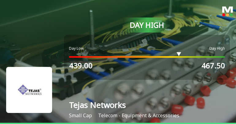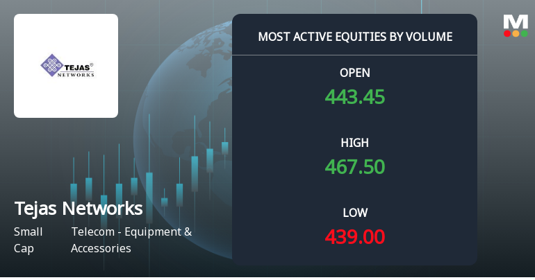 2026-03-10 09:45:59Tejas Networks Ltd recorded a robust intraday performance on 10 Mar 2026, surging to a day’s high of Rs 467.2, marking a significant 9.61% increase from its previous close. The stock outperformed its sector and broader market indices, reflecting notable trading momentum amid a mixed market backdrop.