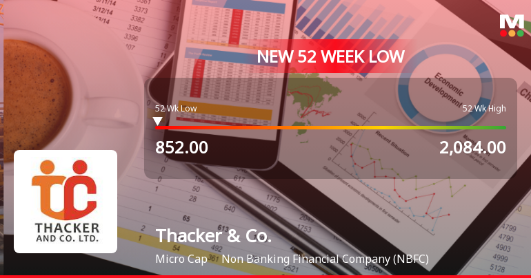"description": "Shares of Thacker & Company Ltd, a micro-cap player in the Non Banking Financial Company (NBFC) sector, declined sharply to a new 52-week low of Rs.852 on 12 Mar 2026, marking a significant drop amid broader market weakness and sector underperformance."