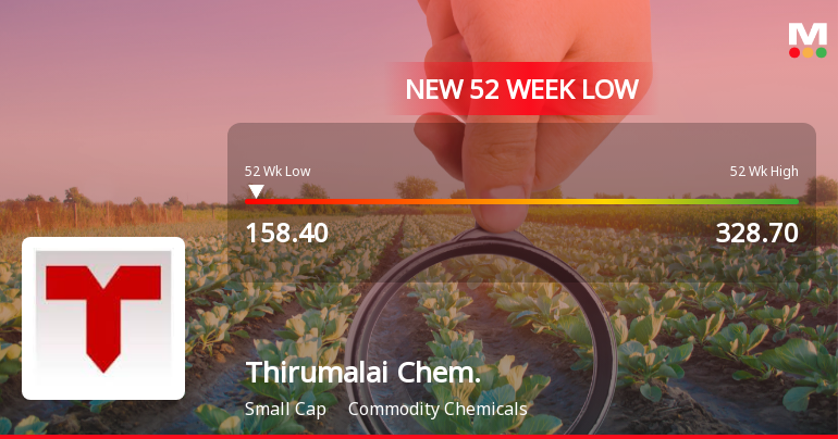 2026-03-09 11:24:42Thirumalai Chemicals Ltd has touched a new 52-week low of Rs.158.4 today, marking a significant decline amid a sustained downtrend. The stock has been under pressure for the past week, reflecting ongoing challenges within the commodity chemicals sector and broader market weakness.