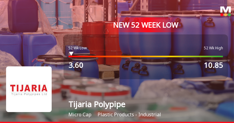 "description": "Tijaria Polypipes Ltd has reached a new 52-week low of Rs.3.6 today, marking a significant decline in its share price amid ongoing underperformance relative to its sector and broader market indices. The stock has been on a downward trajectory, reflecting persistent challenges in its financial metrics and market positioning."