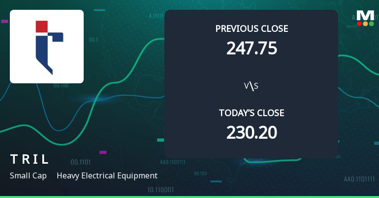 Transformers & Rectifiers India Ltd (TRIL) touched a new 52-week low of Rs.227.25 today, marking a significant decline in its stock price amid broader market fluctuations and sectoral pressures. This fresh low reflects ongoing challenges faced by the company within the Heavy Electrical Equipment industry, despite some positive financial indicators reported recently.