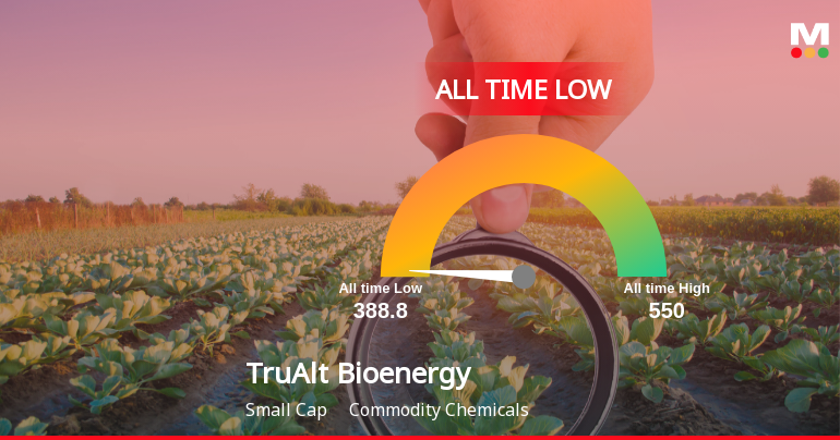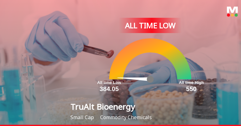 2026-01-09 12:23:50TruAlt Bioenergy’s stock has reached an unprecedented low, closing just 0.05% above its 52-week low of ₹384.05, marking a significant milestone in its recent market performance. The commodity chemicals company has experienced sustained declines across multiple timeframes, reflecting a challenging period for the stock within its sector.