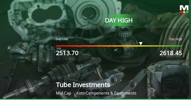 "title": "Tube Investments of India Ltd Surges 5.34% to Day's High of Rs 2583.15 — Outperforms Sector by 2.06 Percentage Points",