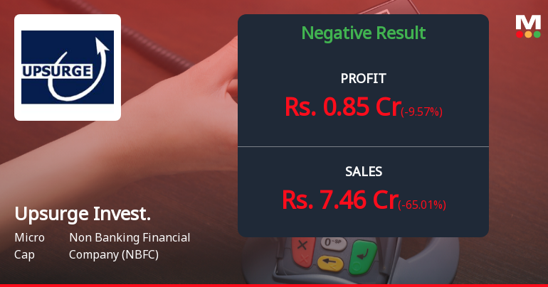 "description": "Upsurge Investment & Finance Ltd., a Mumbai-based non-banking financial company (NBFC) with a market capitalisation of ₹152.54 crores, reported a concerning third quarter for FY2026, with net profit plunging 51.70% quarter-on-quarter to ₹0.85 crores from ₹0.94 crores in Q2 FY26. The decline comes amid a dramatic 65.01% sequential revenue contraction, highlighting persistent volatility in the company's earnings trajectory that has troubled investors throughout the fiscal year."