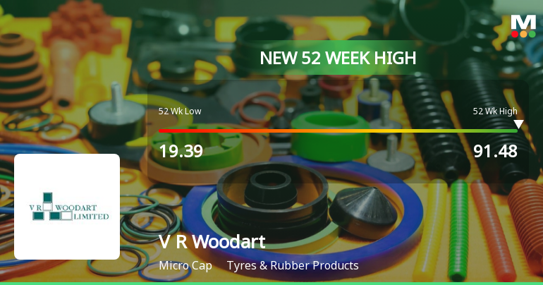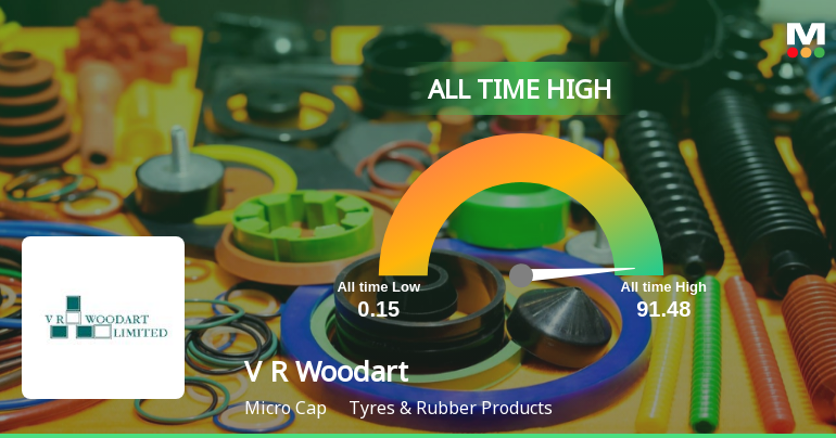2026-02-24 09:56:56V R Woodart Ltd, a key player in the Tyres & Rubber Products sector, surged to a fresh 52-week and all-time high of Rs.91.48 today, reflecting a remarkable rally that has captured market attention. The stock’s momentum has been sustained over the past twelve trading sessions, culminating in a substantial 69.39% return during this period.