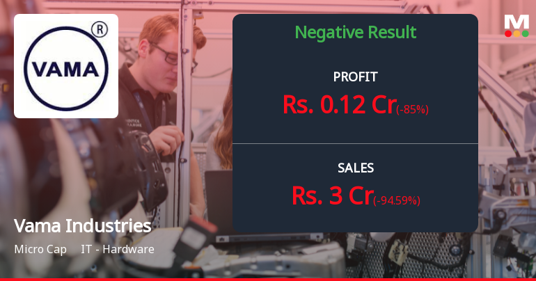 2026-02-14 08:48:42Vama Industries Ltd., a micro-cap system integrator serving space and defence sectors, reported a return to profitability in Q3 FY26 with net profit of ₹0.12 crores, reversing the ₹0.17 crore loss posted in Q2 FY26. However, the quarterly profit represents an 85.00% year-on-year decline from ₹0.80 crores in Q3 FY25, highlighting the severe operational challenges plaguing the ₹22.00 crore market capitalisation company. The stock closed at ₹4.20 on February 13, down 3.45% on the day, trading 61.82% below its 52-week high of ₹11.00 as investors continue to punish the company for its dramatic revenue collapse and deteriorating fundamentals.