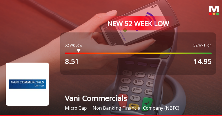 2025-12-30 12:04:18Vani Commercials Ltd, a Non Banking Financial Company (NBFC), touched a fresh 52-week low of Rs.8.51 on 30 Dec 2025, marking a significant decline amid sustained selling pressure. The stock has underperformed its sector and broader market indices, reflecting ongoing concerns about its financial health and market positioning.