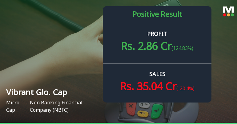 2026-02-12 09:40:44Vibrant Global Capital Ltd., a micro-cap non-banking financial company with a market capitalisation of ₹88.51 crores, reported a mixed performance in Q3 FY26, posting a net profit of ₹2.86 crores—a 62.50% sequential improvement from Q2 FY26's ₹1.76 crores. However, this profit recovery was overshadowed by a concerning 45.67% quarter-on-quarter revenue collapse to ₹35.04 crores, marking the lowest quarterly sales figure in recent periods. The stock, trading at ₹38.64, has declined 25.39% over the past year, significantly underperforming both the Sensex and its NBFC sector peers.