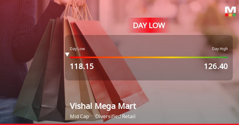 "description": "Shares of Vishal Mega Mart declined sharply on 28 Jan 2026, touching an intraday low of Rs 118.15, reflecting a significant price correction amid broader market dynamics and sector-specific pressures."
