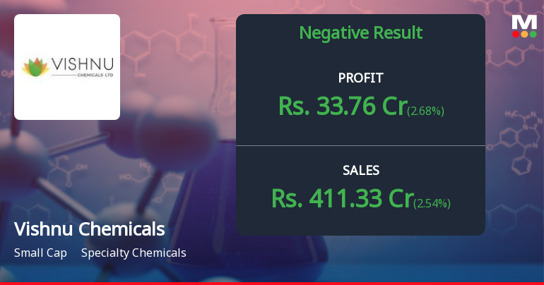 2026-01-31 19:30:54Vishnu Chemicals Limited, a Hyderabad-based specialty chromium chemicals manufacturer, reported a marginal decline in net profit for Q3 FY26, with earnings of ₹33.76 crores compared to ₹34.40 crores in Q3 FY25, representing a year-on-year decline of 1.86%. However, on a sequential basis, the company posted a modest improvement of 2.68% from Q2 FY26's ₹32.88 crores. The stock traded at ₹522.45 on January 30, 2026, up 1.20% from the previous close, giving the company a market capitalisation of ₹3,453 crores.