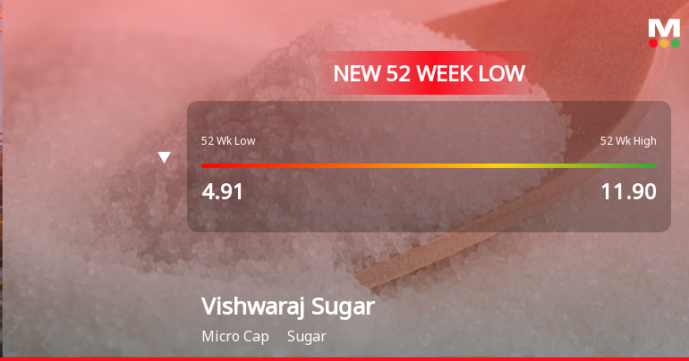 2026-03-27 12:05:00A sharp decline in Vishwaraj Sugar Industries Ltd has pushed the stock to a fresh 52-week low of Rs 4.35 on 27 Mar 2026, marking a 46.63% drop over the past year and signalling sustained pressure amid weak fundamentals and challenging market conditions.