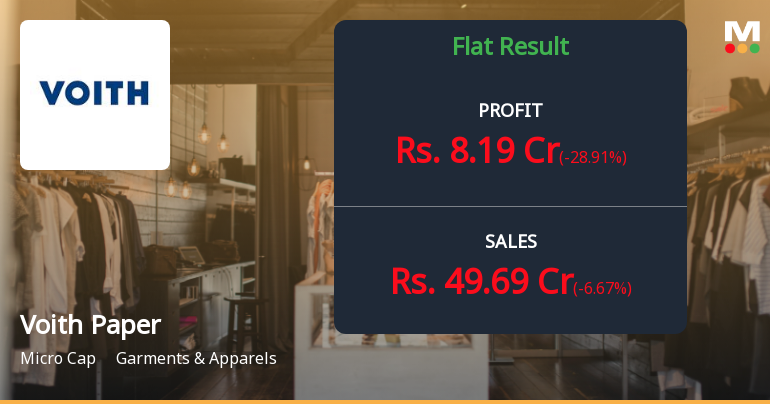 2026-02-05 11:00:18Voith Paper Fabrics India Ltd has reported a flat financial performance for the quarter ended December 2025, signalling a shift from its previously positive growth trajectory. Despite a healthy 22.5% rise in profit after tax over the last six months, the company’s overall financial trend score has declined sharply, reflecting challenges in sustaining revenue growth and margin expansion in a competitive Garments & Apparels sector.